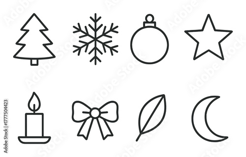 Christmas icons: tree, snowflake, ornament, star, candle, bow, leaf, crescent