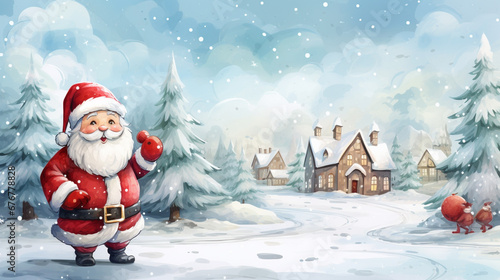 Christmas illustration background with pine forest, Santa Claus, snowman and white snow-covered houses. Cute, winter landscape.