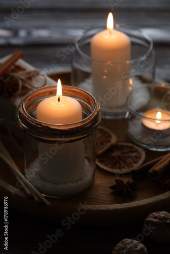 Christmas lanterns, matches and spices on table, closeup