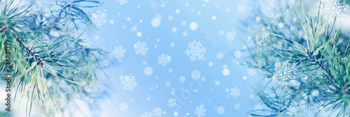 Christmas light background, snow, fir branches, snowflakes, bokeh