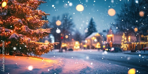 Christmas lights glowing on a snowy night