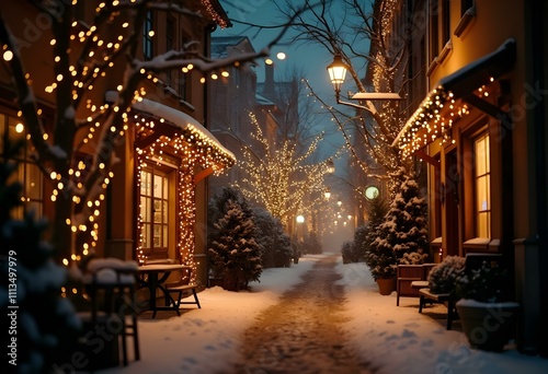 Christmas lights on a German street, snowing weather, no people, fir branches, poinsetiae