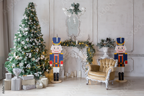 Christmas morning . classic apartments with a white fireplace, decorated fir tree, sofa, large windows and chandelier.