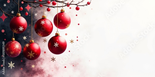 Christmas, New Year holiday background banner, red and white balls and snowflakes with copy space.