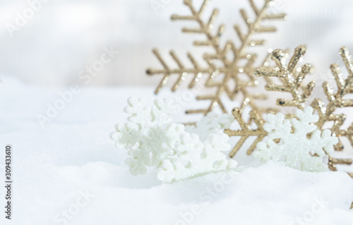 Christmas of winter - Christmas Snowflakes on snow, Winter holidays concept. White and Golden Snowflakes decorations In Snow Background