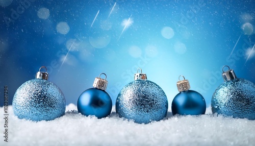Christmas or New Year greeting card Baubles On Snow with copy space, blue filter and motion blur.