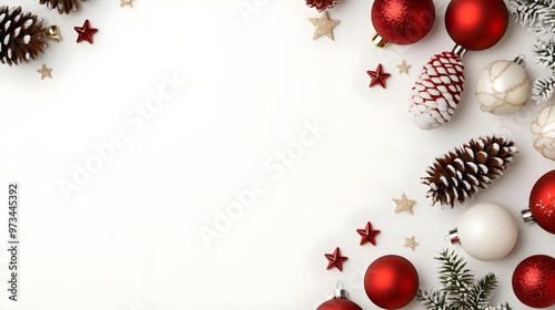 Christmas Ornament & Pine Cone Flat Lay - White Background