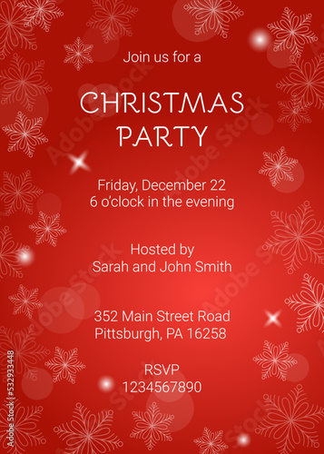 Christmas party invitation with snowflakes and glares on red gradient background.