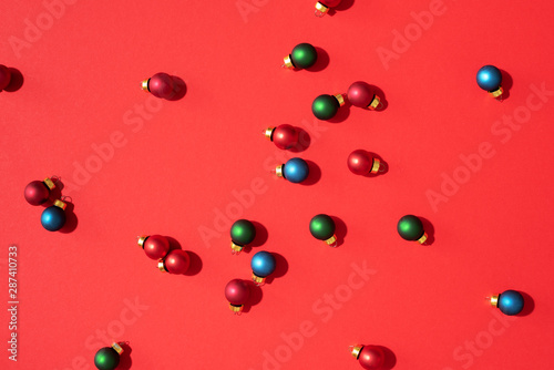 Christmas pattern made of colorful christmas baubles on red background. Flat lay, top view. New year concept