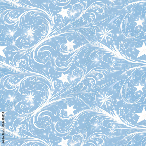 Christmas pattern snowflakes ornament in light blue, white colors. Winter background with stars, swirls textures. Perfect as wrapping paper, Digital paper, packaging, fabric textile, wallpaper