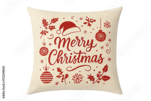 Christmas pillow showing holiday greetings and festive decor with santa hat and ornaments, transparent background