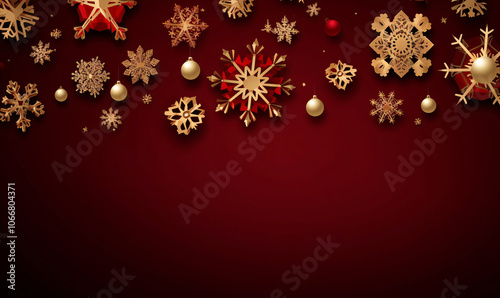 Christmas poster on a dark red background. Illustration of Christmas background with golden snowflakes and geometric decorative elements.