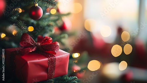 Christmas present box with a bow on a decorated tree against a blurred background. : Generative AI
