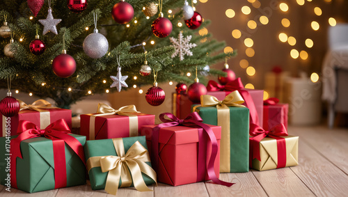 Christmas presents in red and green wrapping with ribbons under decorated tree with lights and ornaments indoors