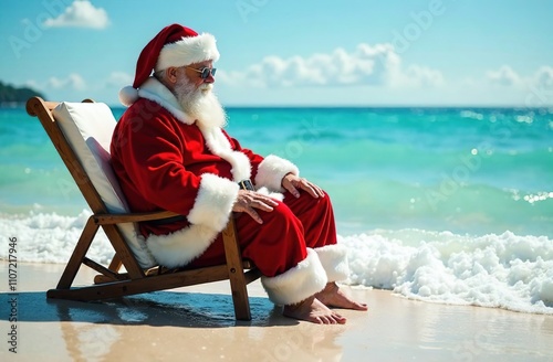 Christmas Santa Claus is sitting on a chaise longue on the beach. Waves wash over his feet. The blue sea. Blue sky on the horizon.