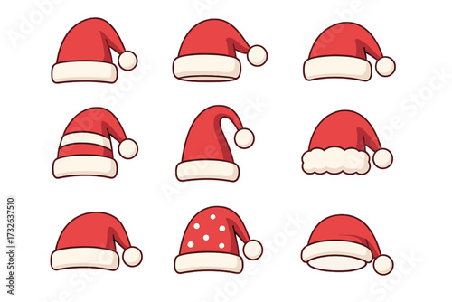 Christmas Santa hats icon set. Flat style vector cartoon illustration. Red holiday cap collection for winter celebration design. New Year costume element isolated on white.