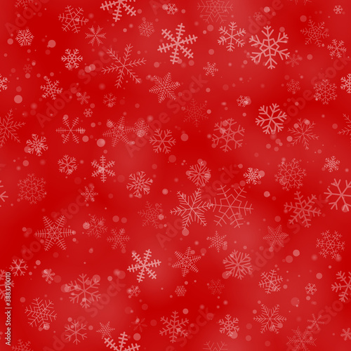 Christmas seamless pattern of snowflakes of different shapes, sizes and transparency, on red background