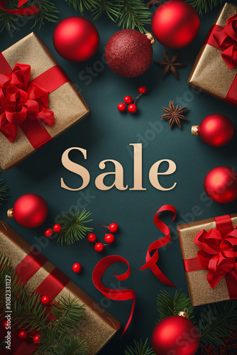 Christmas seasonal design with „Sale” text and gift boxes, copy space background. Winter sales banner perfect for stores, shopping malls and internet shop. Template with Christmas decorations.