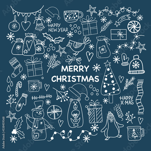 Christmas set. Design elements, children's. Cute cartoon style. New Year cards. Comfort, clothes, things, symbols, toys. Flat style. Clip art, advertising.