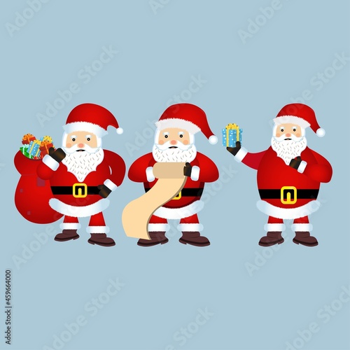 Christmas set of Santa Claus vector design on a rusty light blue background. Santa Claus elements design collection with a blue color gift. Santa Clause vector illustration for the Christmas event.Chr