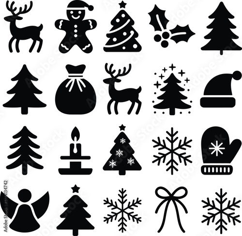 Christmas Silhouette Icons Set: Black Holiday Symbols Vector with Reindeer, Tree, Snowflake, and Gingerbread Man