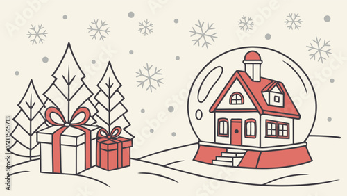 Christmas snow globe with house and gifts, christmas trees and snowflakes for holiday season vector art