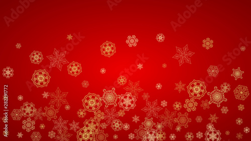 Christmas snowflakes on red background. Horizontal glitter frame for winter banner, gift coupon, voucher, ads, party event. Santa Claus color with golden Christmas snowflakes. Falling snow for holiday