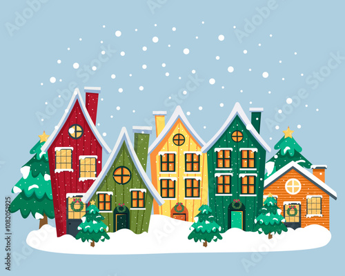 Christmas snowy houses with snow covered pine trees snowfall village scenery landscape merry Christmas holidays vector illustration
