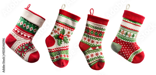 Christmas Socks Set. Christmas Wool Knitted Socks with holly, snowflakes, and geometric pattern designs Isolated on White Transparent Background, PNG Element. Christmas stocking tradition