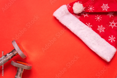 Christmas sport flatlay composition with dumbbells and christmas hat on red background.