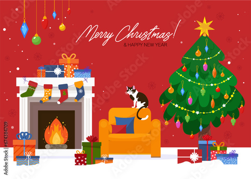 Christmas stocking on fireplace and gift boxes. Christmas long socks for Santa Claus presents. Christmas fireplace scene concept in flat design. Merry Christmas and Happy New Year. Winter holidays.