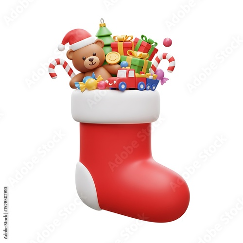 Christmas stocking overflowing with gifts, candies, and a teddy bear. Festive holiday scene.