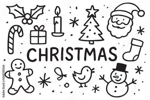 Christmas themed icons with a festive design Santa, Christmas tree, gifts, snowman, candy cane, and more for holiday decorations and celebrations.