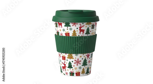 Christmas Themed Reusable Coffee Cup with Green Lid and Sleeve