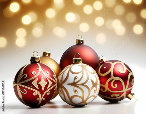 Christmas toys in the shape of red and gold baubles with glitter designs on a white background. Generative AI