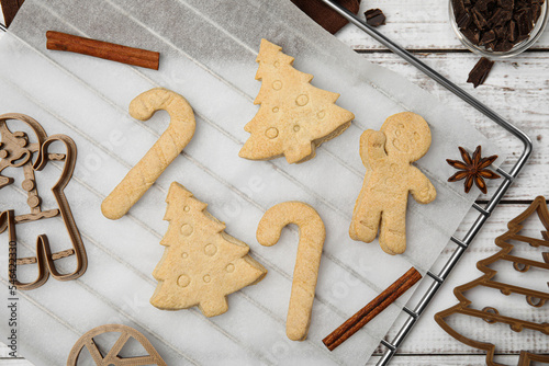 Christmas treat. Flat lay composition with cookie cutters and baked biscuits on white wooden table