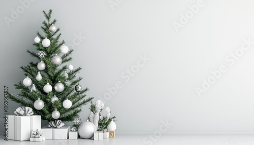 Christmas tree adorned with ornaments and gifts on a simple white background.