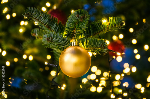 Christmas Tree Ball Ornament Festive Holiday Decoration Gold Closeup Depth of Field Bokeh Centered