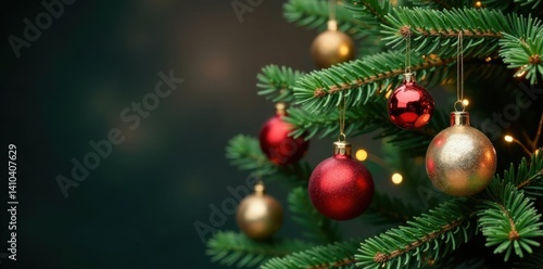 Christmas tree branch with ornaments, evergreen, christmas tree