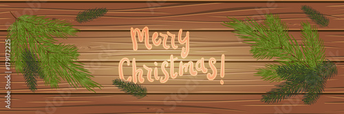 Christmas tree branches on a wooden background. top view. Christmas card. festive background. Vector illustration. Eps 10.