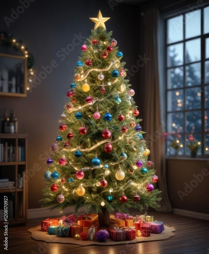 Christmas tree decorated with a variety of colorful ornaments and sparkling fairy lights, decorative lighting, ornaments