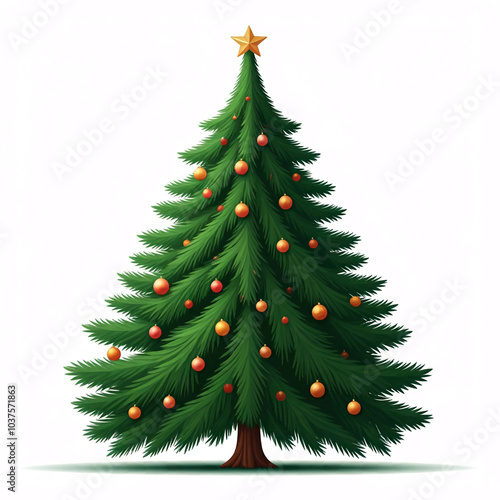 christmas tree decorated with ornaments and a star on top isolated on white background