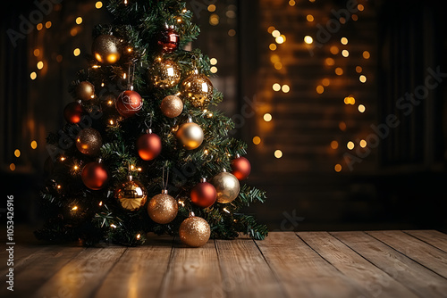 Christmas tree decorated with red and gold ornaments, with glowing lights and empty wooden table foreground.