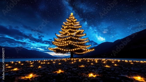 Christmas tree decorated with twinkling fairy lights under the starry sky in a remote village