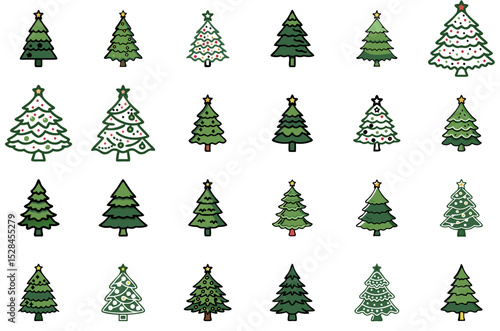 Christmas tree icon set with decorated, snowy and green pines in outlined festive style. 24 vector elements. Concept: holiday illustration, winter decoration, Xmas branding.
