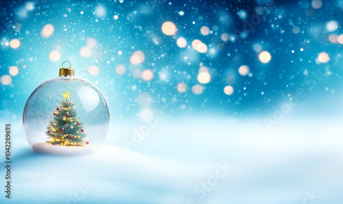 Christmas Tree in Glass Ball on Snow Against Blue Bokeh Background