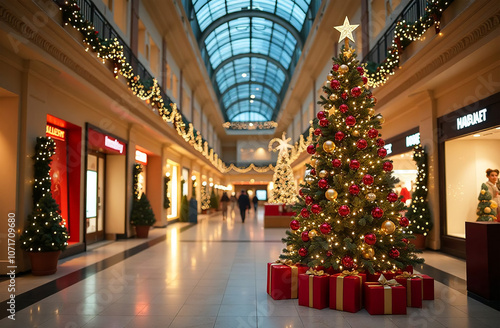 Christmas tree in the shopping mall. Christmas and New Year holidays concept