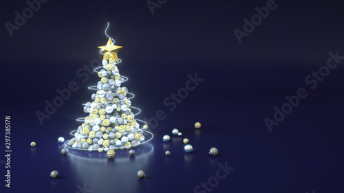 Christmas tree made of balls on blue background with copy space. 3d rendering illustration. Silver, gold and grey colors.Minimal Christmas creative concept