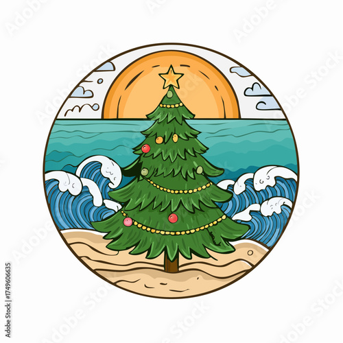 Christmas tree on a beautiful beach, with waves and a sunset in the background