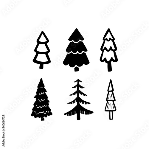 Christmas Tree various set. Collection black-white silhouette. Monochrome hand drawn vector illustration in doodle style.